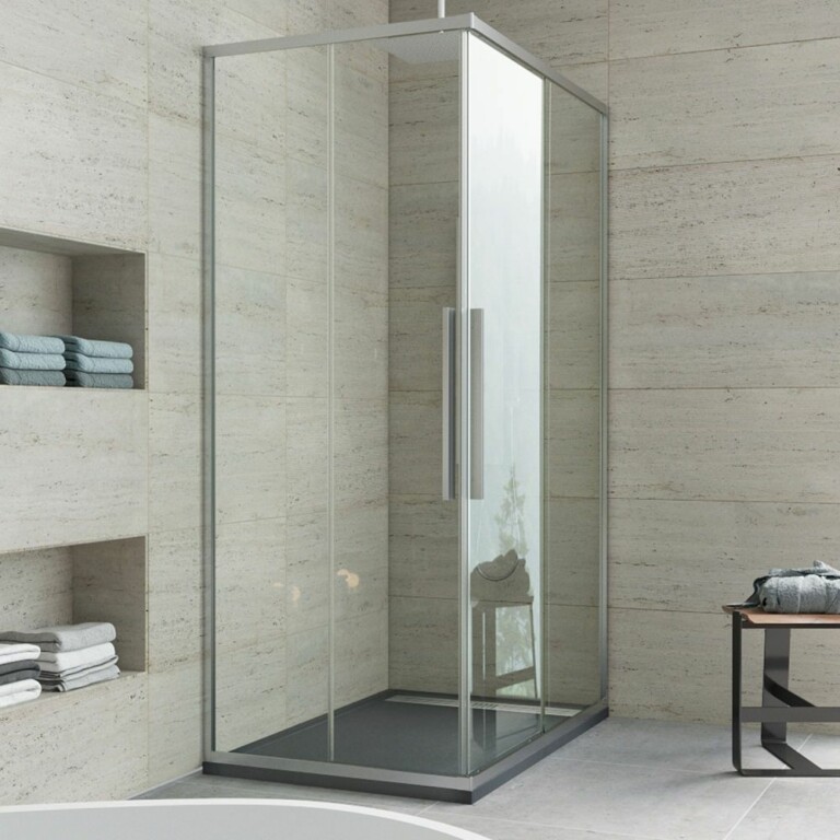 Nos cabines de douche sont fabriquées en verre trempé, utilisant la technologie TECNOGLASS. Le verre a une épaisseur de membrane de 100 microns et, s’il se brise, il se brise en petites particules non coupantes, minimisant les dommages à l’environnement et aux personnes. Nous respectons la norme UNI EN14428.