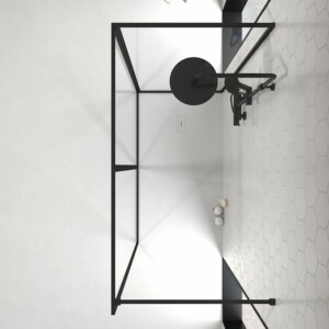 Su beau profilage minimaliste de seulement 2 cm (profilé mural et bras de serrage extensible) offre une détail unique et élégant à une cloison d’une seule feuille de verre incolore de 4 mm. avec traitement anti-calcaire inclus.