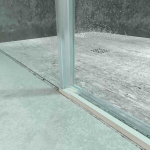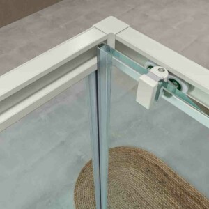 Tout d’abord, la composition de trois vantaux pour receveurs de douche d’angle (un vantail fixe, une glissière et un côté fixe) est étanche, pratique et aura une usure minimale sur ses doubles roulements, qui traversent le cadre supérieur. L’avant et les côtés sont en verre trempé de 6 mm avec traitement anti-calcaire.