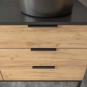 Meubles de salle de bain ELLA style industriel par Varobath Il vous offre un style de décoration très élégant pour votre salle de bain. Avec une variété de tailles et une finition en chêne clair, ce modèle vous permet de décorer votre salle de bain, de profiter de l’espace et d’avoir un endroit pour ranger vos produits d’hygiène.