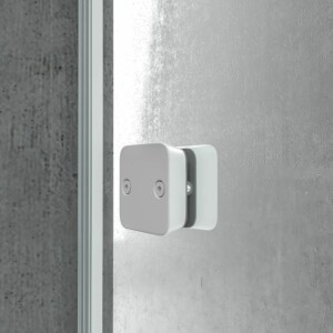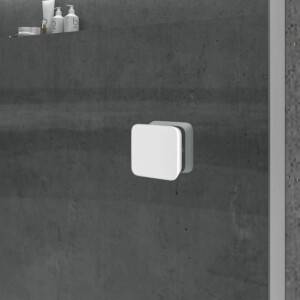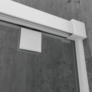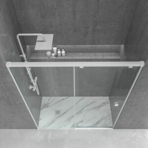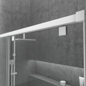 • 1 paroi de douche frontale fixe – 1 porte coulissante blanc mat sans profilé inférieur, verre trempé sécurit 8 mm, hauteur 200 cm.