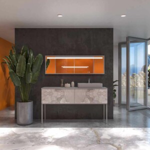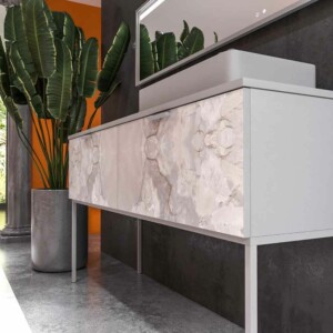 Il est fabriqué en MDF, un matériau très résistant et durable pour que le meuble ait une longue durée de vie. La peinture cette base d’ions argent est projetée sur le module antibactérien ce qui le rend plus résistant. La façade imprimée en 3D effet marbre en fait un meuble de salle de bain design unique sur le marché national et international.