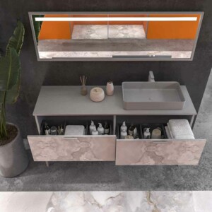 Vous pouvez choisir les meubles en plusieurs différentes finitions de marbre combinées à un large gamme de couleurs pour ne pas avoir de problèmes de compatibilité avec le reste des accessoires de salle de bain.