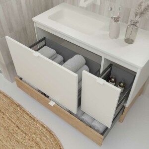 - Armoire à 2 tiroirs : L’armoire est disponible avec 2 tiroirs avec un fond en graphite avec des séparateurs pour organiser les produits. Les tiroirs ont des guides cachés pour une fermeture plus douce et plus amortie. Chaque tiroir a une poignée en métal pour une prise en main plus confortable.