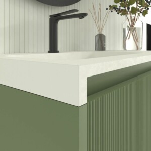 Il est fabriqué en MDF, un matériau très résistant et durable pour que le meuble ait une longue durée de vie. La peinture cette base d’ions argent est projetée sur le module antibactérien ce qui le rend plus résistant. La façade à lattes en fait un meuble de salle de bain design unique sur le marché national et international.