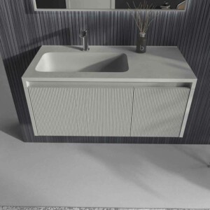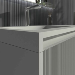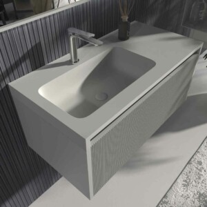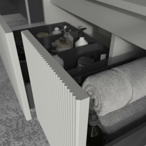 Il est fabriqué en MDF, un matériau très résistant et durable pour que le meuble ait une longue durée de vie. La peinture cette base d’ions argent est projetée sur le module antibactérien ce qui le rend plus résistant. La façade à lattes en fait un meuble de salle de bain design unique sur le marché national et international.