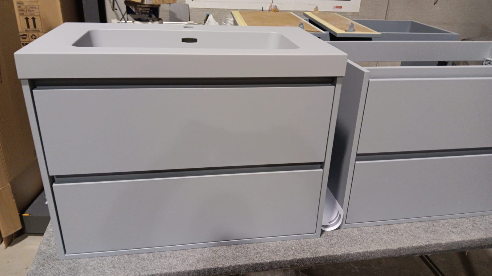 Meuble de salle de bain suspendu CLAIRE 120 cm 2 tiroirs RAL 1035 Profondeur 55 cm – Vasque en SOLID SURFACE 120 cm droite blanche mesure exacte- Meuble de salle de bain suspendu CLAIRE 89,5 cm 2 tiroir RAL 7016 – Vasque en SOLID SURFACE 89,5 cm blanche mesure exacte