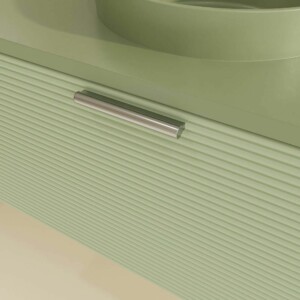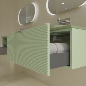 Il est fabriqué en MDF, un matériau très résistant et durable pour que le meuble ait une longue durée de vie. La peinture cette base d’ions argent est projetée sur le module antibactérien ce qui le rend plus résistant. La façade à lattes en fait un meuble de salle de bain design unique sur le marché national et international.