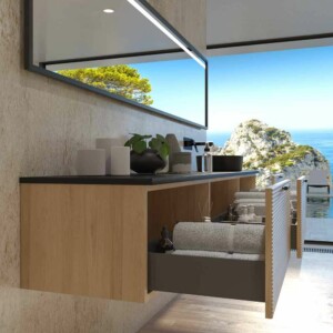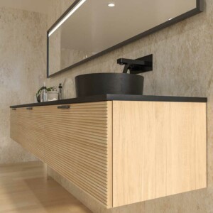 Il est fabriqué en MDF, un matériau très résistant et durable pour que le meuble ait une longue durée de vie. La peinture cette base d’ions argent est projetée sur le module antibactérien ce qui le rend plus résistant. La façade à lattes en fait un meuble de salle de bain design unique sur le marché national et international.