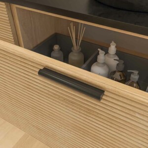 Il est composé de 3 tiroirs Fabriqué avec des guides métalliques à extraction totale et fermeture amortie. L’ouverture et la fermeture des tiroirs se font avec un système de poignées en différentes finitions au choix.