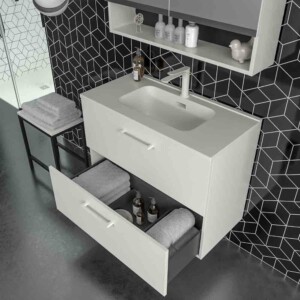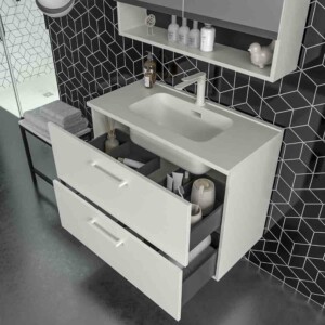 Surfaces lisses sans saillies, bords droits, tiroirs coulissants et utilisation silencieuse. La armoire de salle de bain moderne NEXO de Varobath apparaît avec un style actuel et pratique vous allez adorer.