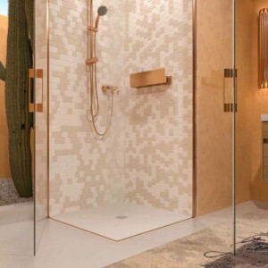 Comme vous pouvez le voir, le coin douche OPEN est très minimaliste, il ne comporte que des profils en aluminium au design actuel (thermo-laqué ou anodisé selon la finition choisie) sur les côtés qui rejoignent le mur. Il a des poignées doubles en finition cuivre et une fermeture magnétique en caoutchouc magnétique qui crée un espace de salle de bain très étroit (avec les joints inférieurs en caoutchouc à onglet et son profil de base en aluminium réduit) qui aidera à préserver la température et à éviter les éclaboussures. L’eau ne sortira pas non plus d’en haut lorsque vous vous doucherez, car cet écran a une hauteur standard de 195 cm.