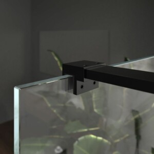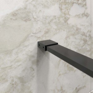 La paroi de douche fixe ZEN fils Verre trempé de 10 mm d’épaisseur, un petit profilé mural en inox thermolaqué NOIR MAT et un bras de serrage en acier jusqu’à 100 cm pour donner une plus grande stabilité à la paroi de douche.