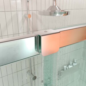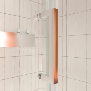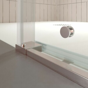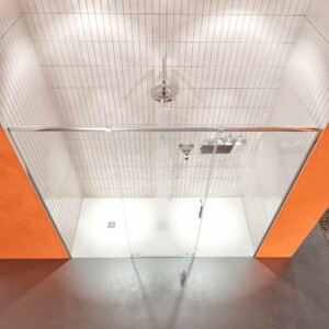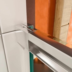 La façade de douche AXER couvre une large gamme de mesures de largeur (95-170 cm) et a une hauteur considérable (195 cm), ce qui empêche toujours les fuites d’eau et améliore la continuité visuelle lorsque le verre est incolore. Les roulements de ce modèle, également en acier, ainsi que sa poignée, donnent un glissement silencieux. Le vantail fixe n’a pas de guide inférieur et le vantail coulissant a un profil bas de 1 cm simplement pour assurer l’étanchéité et servir de guide à la porte.