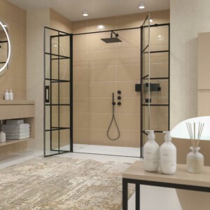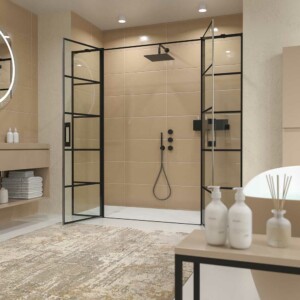 Particulièrement recommandé pour les cas où vous souhaitez obtenir une bonne entrée dans la douche, mais vous devez mettre 2 parties fixes (une à chaque extrémité) pour éviter que le vantail ne touche aucun élément de la salle de bain comme les toilettes ou le lavabo lors de l’ouverture à l’extérieur