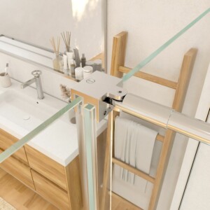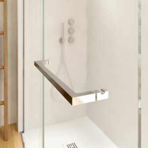 • Même le moindre détail de cette cabine de douche est soigné. La poignée avec porte-serviettes intégré est moderne, pratique (puisqu’elle dépasse à peine, il n’y aura pas de coups dans les salles de bains étroites) et elle est également en acier inoxydable.