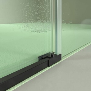La façade de douche PETRA couvre une large gamme de mesures de largeur (95-170 cm) et a une hauteur considérable (200 cm), ce qui empêche toujours les fuites d’eau et améliore la continuité visuelle lorsque le verre est incolore. Les roulements de ce modèle, également en acier, ainsi que sa poignée, donnent une glissement silencieux. Le vantail fixe n’a pas de guide inférieur et le vantail coulissant a un profil bas de 1 cm simplement pour assurer l’étanchéité et servir de guide à la porte.