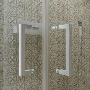- Les profilés de la paroi de douche d’angle AXER sont en acier inoxydable finition blanc mat. Un matériau très résistant à l’usure et à l’humidité.