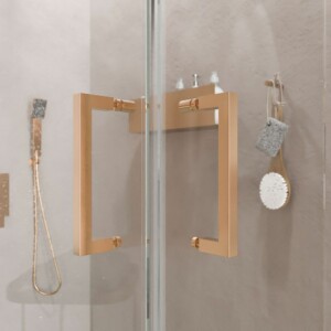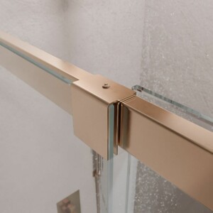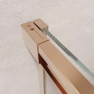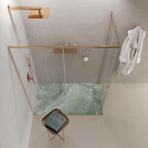 - Les profilés de la paroi de douche d’angle AXER sont en acier inoxydable finition cuivre. Un matériau très résistant à l’usure et à l’humidité.